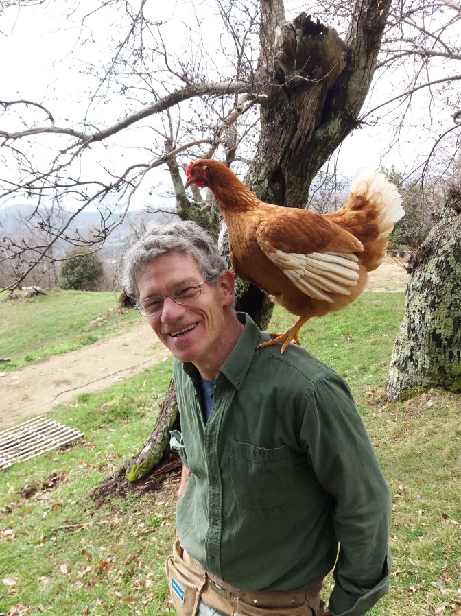 There are two ways of getting chickens from the coop to the tractor and back again. One is by herding them which is doable with only three and the other is by enticing. We have taught our chickens to follow us to heaven and back when we have a yogurt container in our hand. Whenever we have scraps that make good chicken treats, we put them in the container – cheese rinds, parsley stems, breadcrumbs, to name a few. Then I tap the container to get their attention (though usually they spot me coming) and they follow me to where I dump the treats, either the coop or the tractor. This was especially important when we saw buzzards circling in the air above and we’d rush our ‘girls’ to a protective enclosure until the danger had passed. It was only months later that we heard from someone in the village that a buzzard can’t pick up a full-grown hen, just chicks.